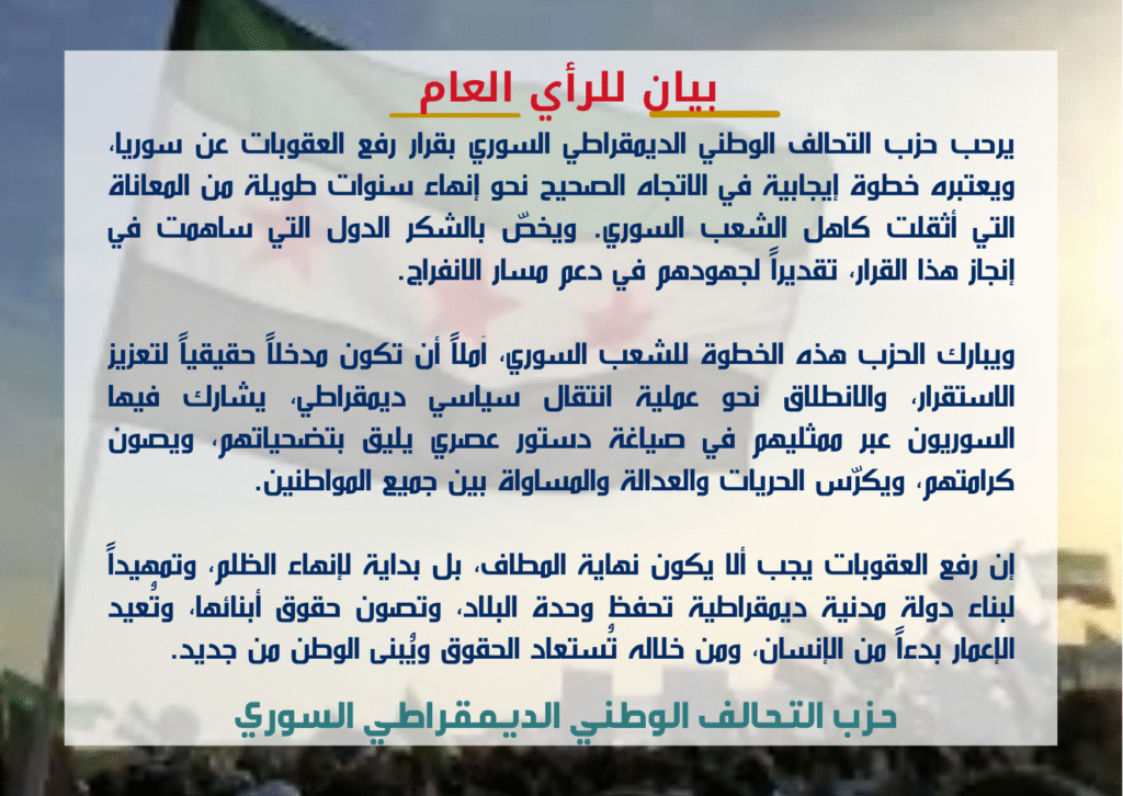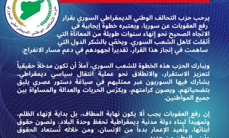 يرحب حزب التحالف الوطني الديمقراطي السوري بقرار رفع العقوبات عن سوريا، ويعتبره خطوة إيجابية في الاتجاه الصحيح نحو إنهاء سنوات طويلة من المعاناة التي أثقلت كاهل الشعب السوري. ويخصّ بالشكر الدول التي ساهمت في إنجاز هذا القرار، تقديراً لجهودهم في دعم مسار الانفراج.