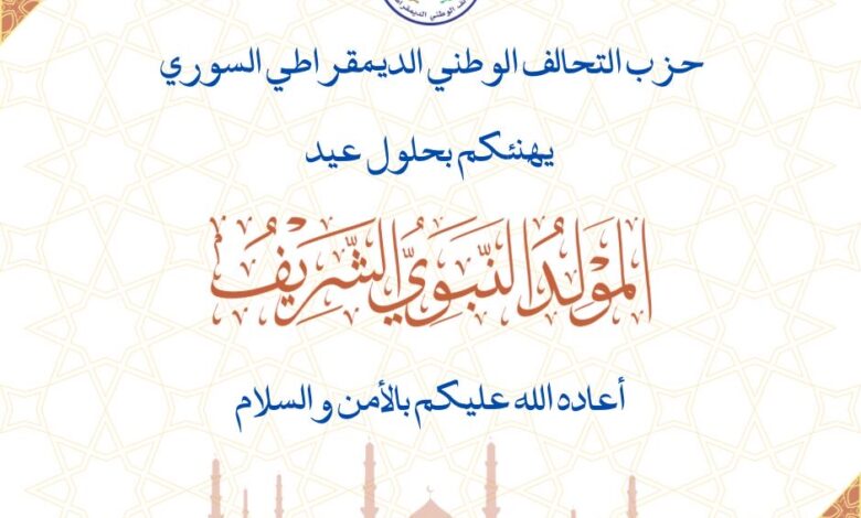 يتقدم حزب التحالف الوطني الديمقراطي السوري بأسمى آيات التهنئة والتبريك للشعب السوري والأمة الإسلامية بمناسبة حلول ذكرى المولد النبوي الشريف ذكرى ميلاد النبي محمد صلى الله عليه وسلم نبي الرحمة والهدى وفي هذه المناسبة المباركة نستذكر القيم العظيمة التي جاء بها رسول الإنسانية قيم المحبة والعدل والتسامح والوحدة راجين من الله العلي القدير أن يعمّ السلام ربوع وطننا الحبيب وأن تتحقق تطلعات شعبنا في الحرية والكرامة والعيش الكريم.
