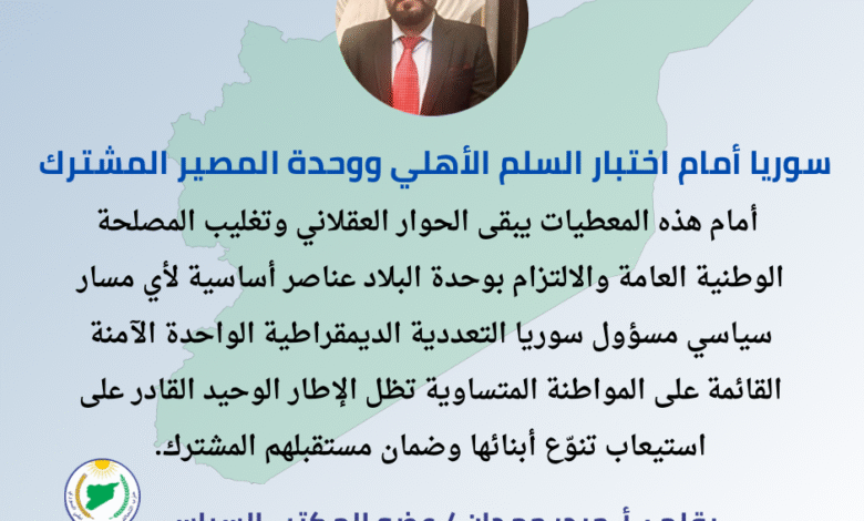 أمام هذه المعطيات، يبقى الحوار العقلاني، وتغليب المصلحة الوطنية العامة، والالتزام بوحدة البلاد، عناصر أساسيةلأي مسار سياسي مسؤول. سوريا التعددية الديمقراطية الواحدة ، الآمنة، القائمة على المواطنة المتساوية، تظلالإطار الوحيد القادر على استيعاب تنوّع أبنائها وضمان مستقبلهم المشترك.